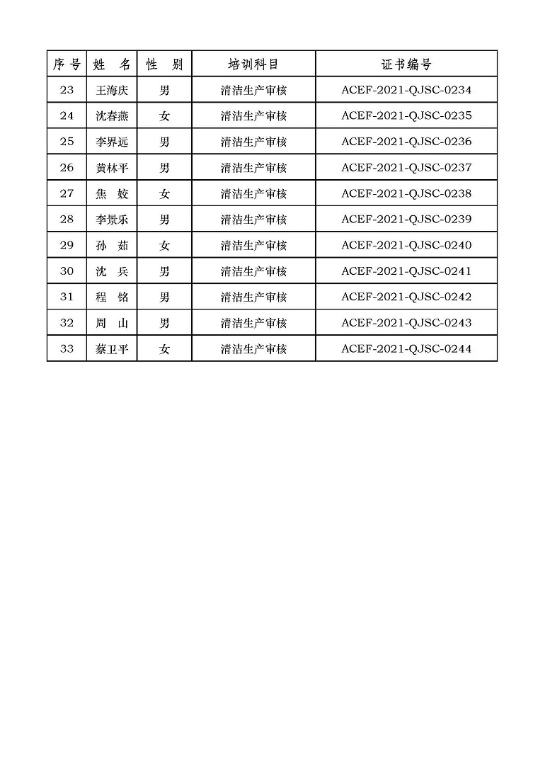 2021年第5期“清洁生产审核从业人员”培训班合格学员公示