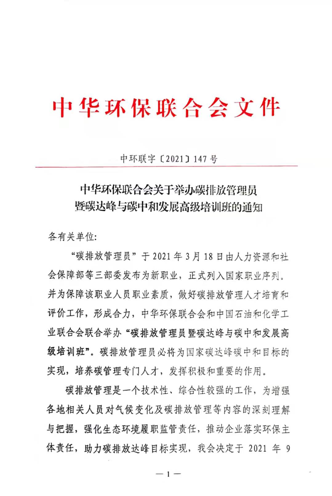 关于举办碳排放管理员暨碳达峰与碳中和发展高级培训班的通知