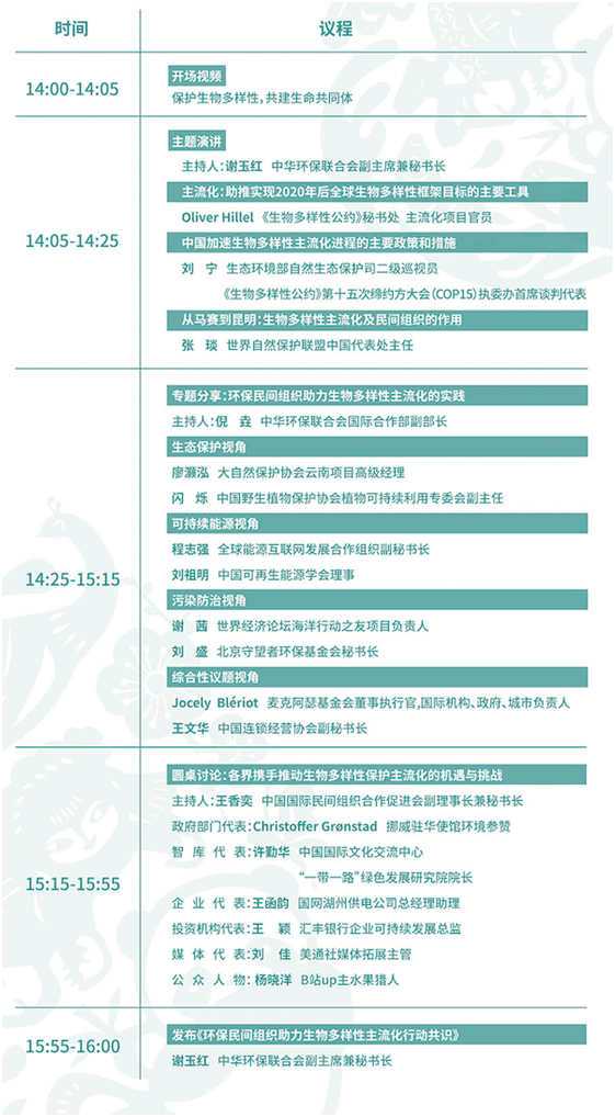 “环保民间组织助力生物多样性主流化”主题论坛将围绕生物多样性保护主流化议题,邀请生态保护、气候与能源、污染防治等不同领域的各国环保非政府组织,探讨不同领域推动生物多样性保护主流化的实践经验和优秀案例,并发布《环保民间组织助力生物多样性主流化行动共识》。会议还将邀请来自政府、私营部门、智库、媒体等领域的相关代表,结合联合国可持续发展目标(SDGs), 开展多利益相关方对话。