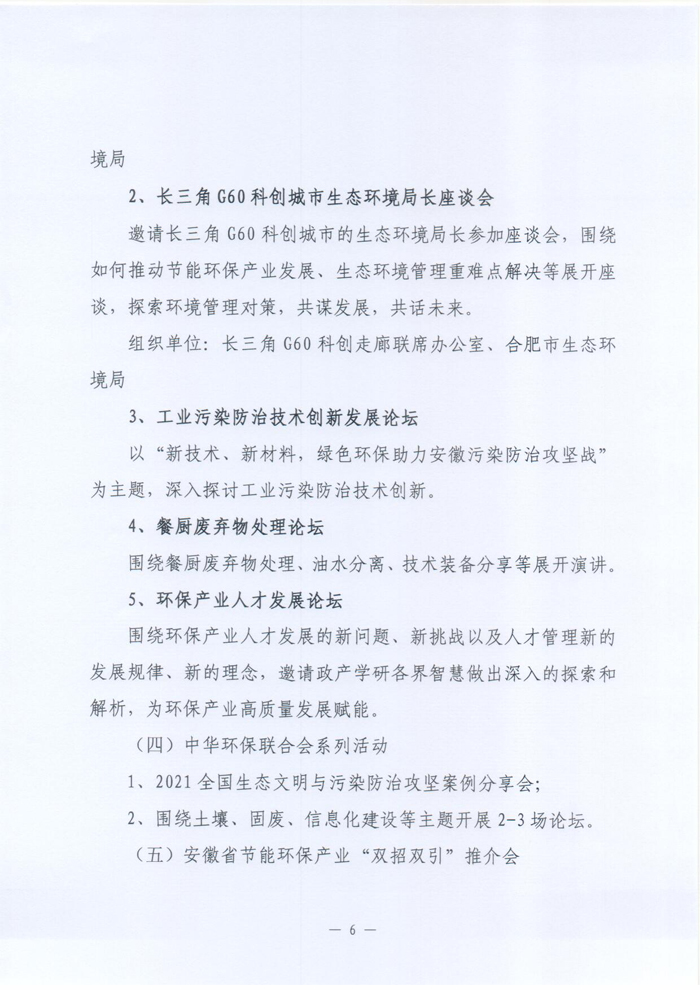 展会包含安徽省暨合肥市节能环保产业成就展、水污染防治技术装备展、土壤污染修复技术装备展、大气污染防治技术装备展、固废处理技术装备展、环卫清洁技术装备展、塑料环保展、智慧环保展、环境监测展等八大展区。同期还将举办数十场专业会议论坛,其中重点包括院士峰会、长三角G60科创城市生态环境局长座谈会、2021全国生态文明与污染防治攻坚案例分享会、安徽省节能环保产业“双招双引”推介会、重大环保项目信息发布与对接会等,政府领导、院士专家、名企名家,共聚一堂、共谋发展、共话未来!