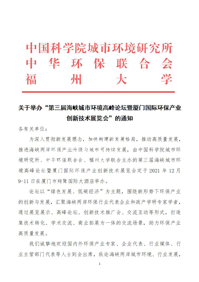 关于举办“第三届海峡城市环境高峰论坛暨厦门国际环保产业创新技术展览会”的通知