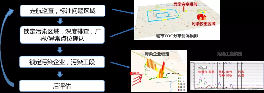 利用走航监测车可以在城市区域内走航,在重点工业园区内走航,在企业不同工段间走航,可以快速找出问题区域、问题点位,排查异常点位,为进一步采取有针对性的管控措施提供有力的数据支撑。走航监测及业务化巡查二十四字工作方针如下:动态快筛、聚焦源头、精准监管、协助执法、效果评估、持续改进,服务于精准监管,最终实现区域VOCs的有效减排,实现区域空气质量的持续改善。