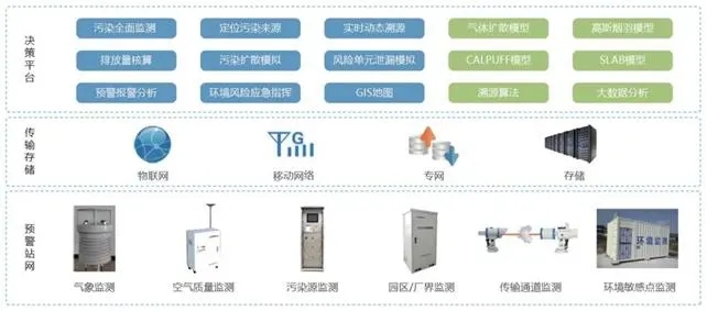 软件部分包含数据收集处理、监测数据查询浏览、超标预警、三维显示、视频监控、统计报表、污染源分析、源扩散模拟、应急指挥、动态溯源、系统管理和移动办公等功能。