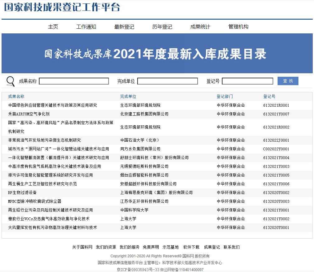 日前,中华环保联合会于2021年期间登记完成的科技成果项目已经获得科技部火炬中心“国家科技成果登记工作平台”的正式收录,相关单位可查询登记号等成果信息。
