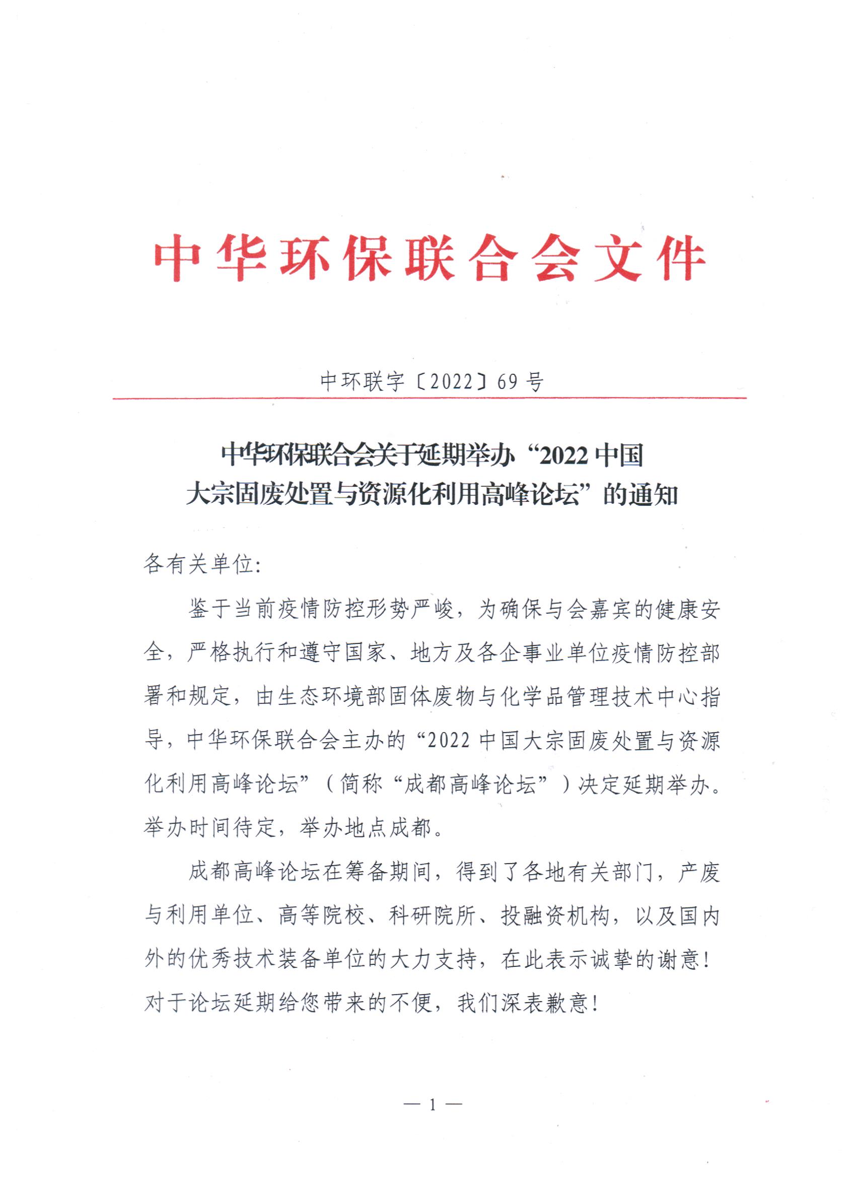 关于延期举办“2022中国大宗固废处置与资源化利用高峰论坛”的通知