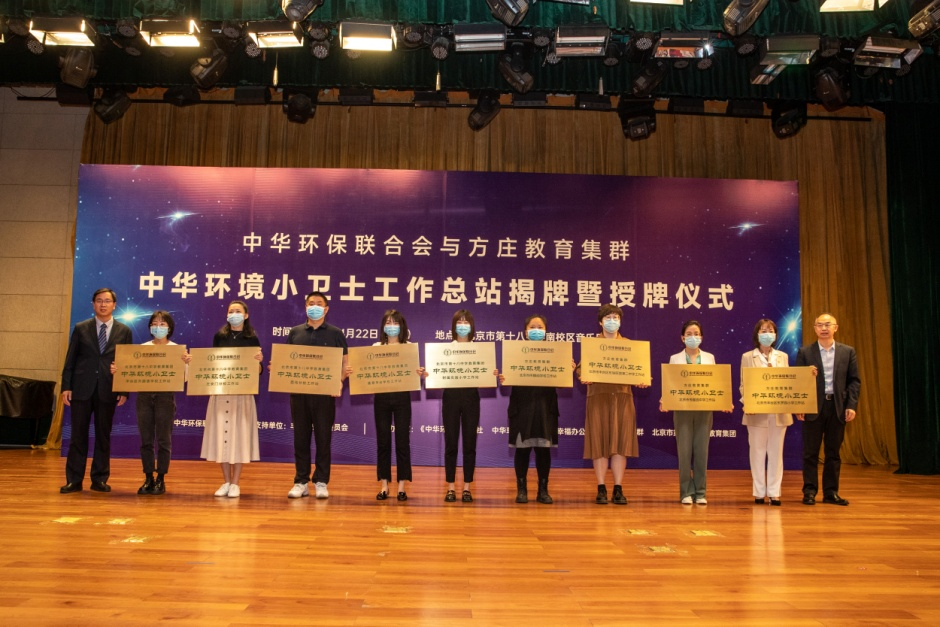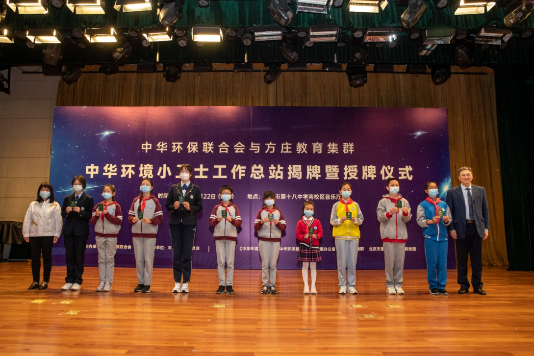 “中华环境小卫士工作总结站揭牌暨授牌仪式”由中华环保联会会主办,北京市丰台区教育委员会作为支持单位全程参与了今天的活动,承办单位是《中华环境》杂志社、中华环境保护基金会小康幸福工程办公室、北京市方庄教育集群以及北京市第十八中学教育集团。