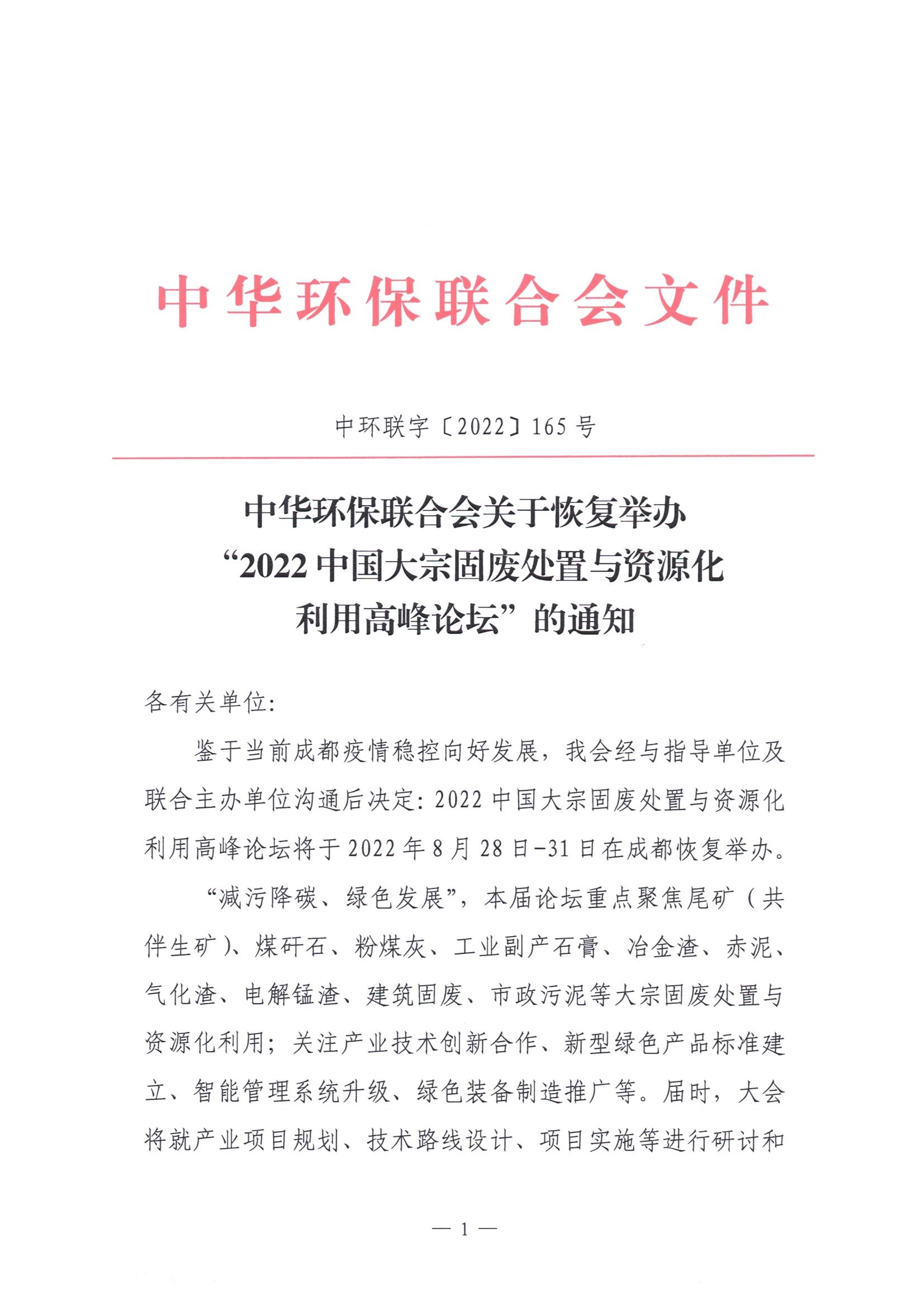 关于恢复举办“2022中国大宗固废处置与资源化利用高峰论坛”的通知