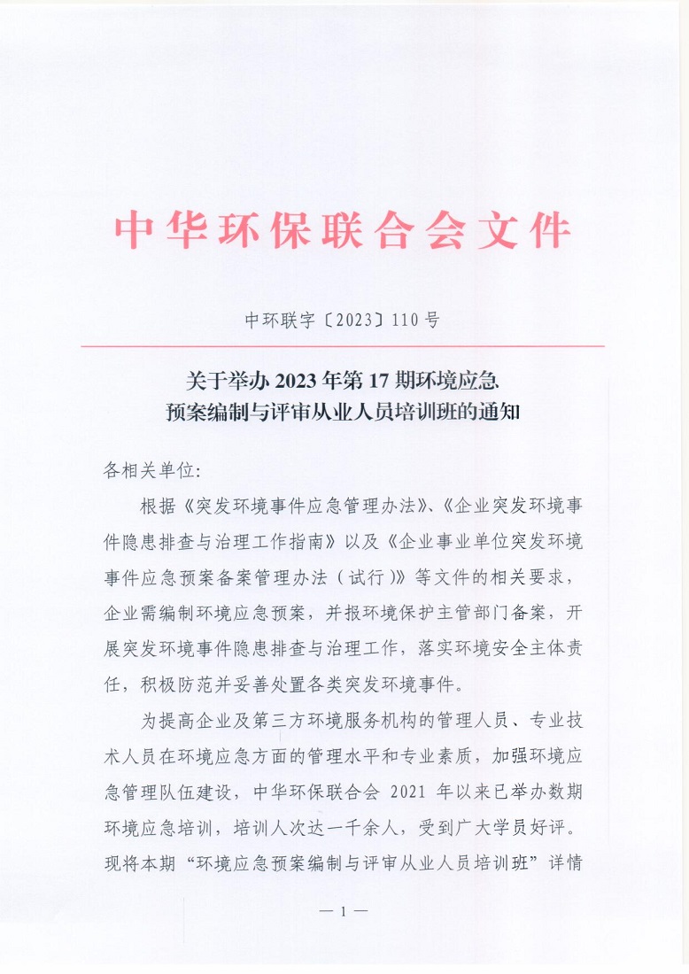 关于举办2023年第17期环境应急预案编制与评审从业人员培训班的通知