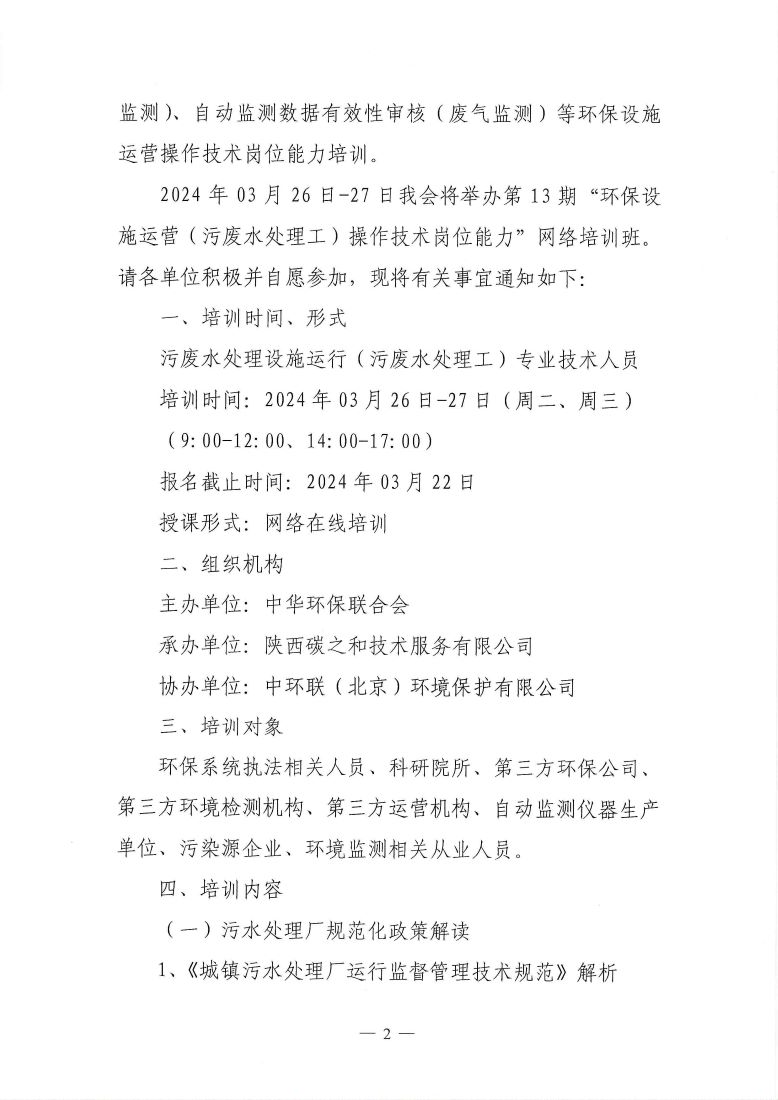 关于举办第13期“环保设施运营(污废水处理工)操作技术岗位能力”网络培训班的通知