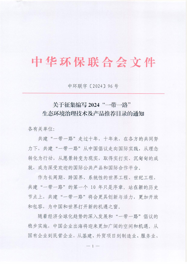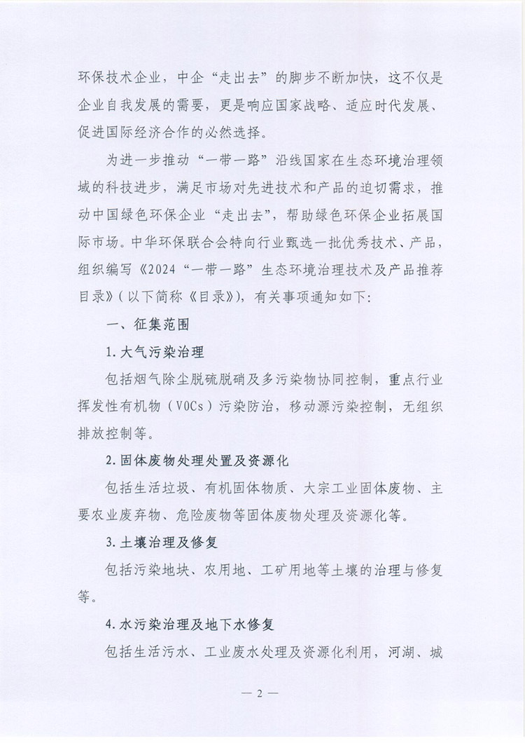 关于征集编写 2024“一带一路’生态环境治理技术及产品推荐目录的通知