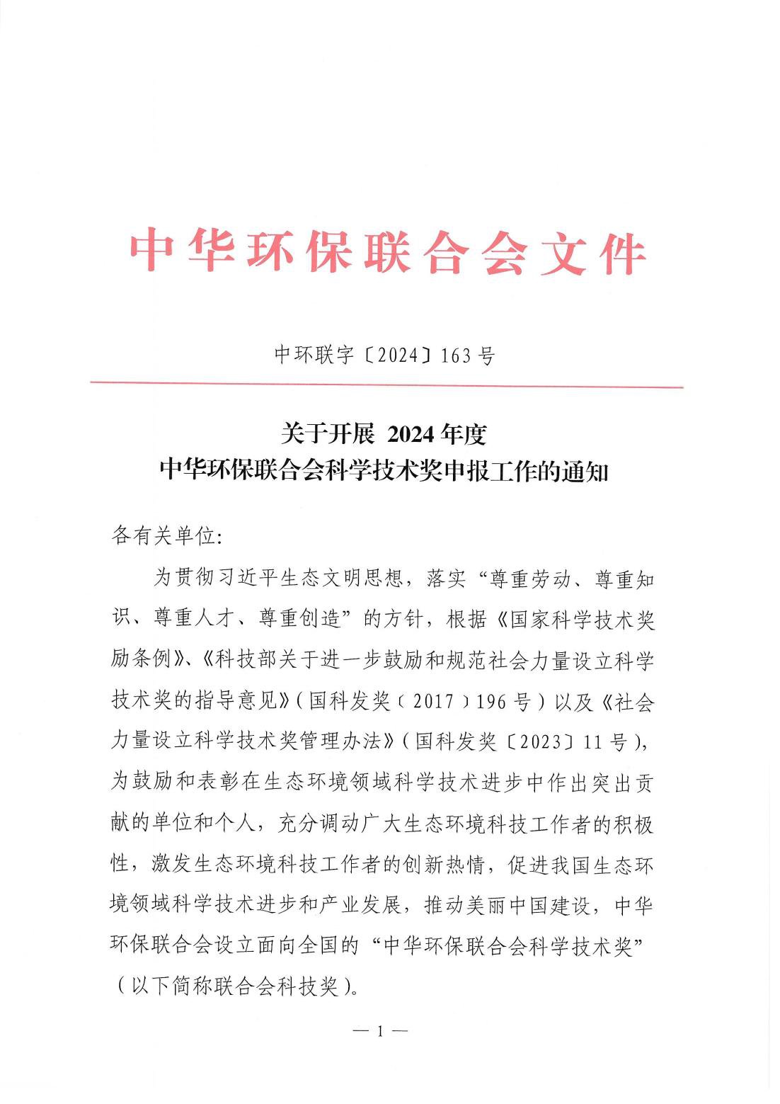 关于开展2024年度中华环保联合会科学技术奖申报工作的通知