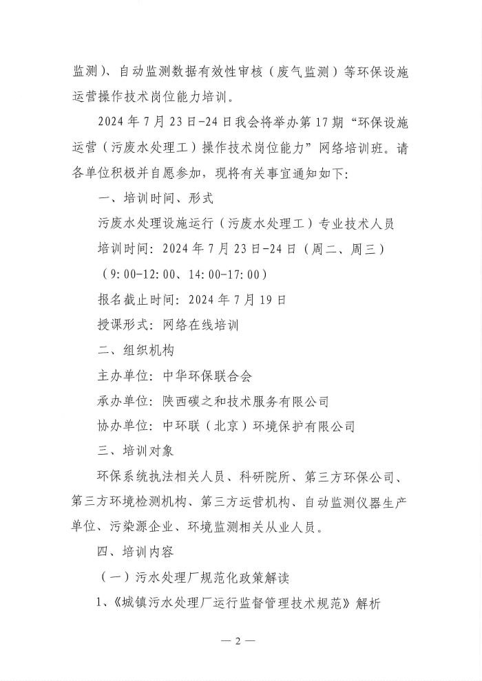 关于举办第17期“环保设施运营(污废水处理工)操作技术岗位能力”网络培训班的通知