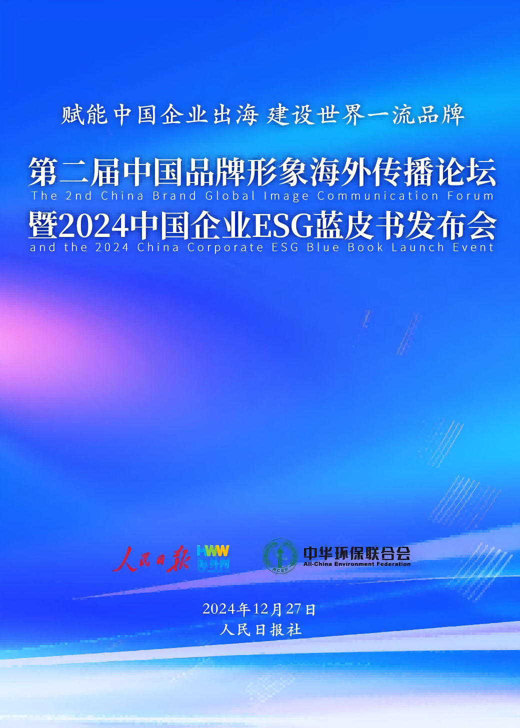 为推动中国品牌海外传播,构建中国ESG话语体系,促进中国企业高质量出海,2024年12月27日,人民日报海外网与中华环保联合会联合主办的第二届中国品牌形象海外传播论坛暨2024中国企业ESG蓝皮书发布会在人民日报社新媒体大厦举行。本次论坛围绕“赋能中国企业出海 建设世界一流品牌”主题,邀请有关领导、业内嘉宾、出海企业,共同探讨建设中国的世界一流品牌,讲好中国品牌与中国企业ESG故事,推动中国企业品牌形象海外传播。论坛还将发布2024年中国企业ESG蓝皮书与案例、中国企业ESG指数100、中国品牌海外影响力100强指数、中国品牌海外传播案例及中国出海品牌新锐指数等研究报告。