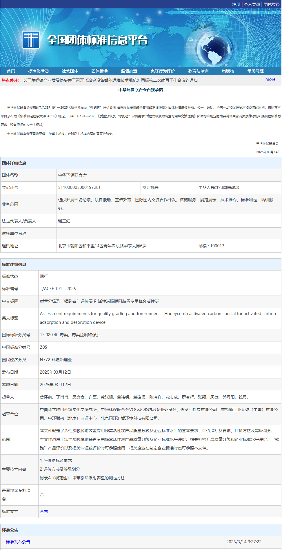 日前,由中华环保联合会和中国技术经济学会组织,中国科学院山西煤炭化学研究所牵头执笔,蜂窝活性炭有限公司、美特斯工业系统(中国) 有限公司、中华环保联合会VOCs污染防治专业委员会、中环联兴(北京)认证中心和北京国环汇智环境科技有限公司等企事业单位共同编制的《质量分级及“领跑者”评价要求 活性炭吸脱附装置专用蜂窝活性炭》(T/ACEF 191—2025、T/CSTE 0706—2025)团体标准(简称“领跑者”评价标准)正式在全国团体标准信息平台发布,并于2025年3月12日起开始实施。该标准自2024年2月起研制,历时一年,充分吸纳各方意见,完成广泛调研与严谨验证。经与现行国内标准对比分析,该标准在基础指标与核心指标上均达到行业领先水平,且创新性引入甲苯循环吸附容量指标,填补技术规范空白。