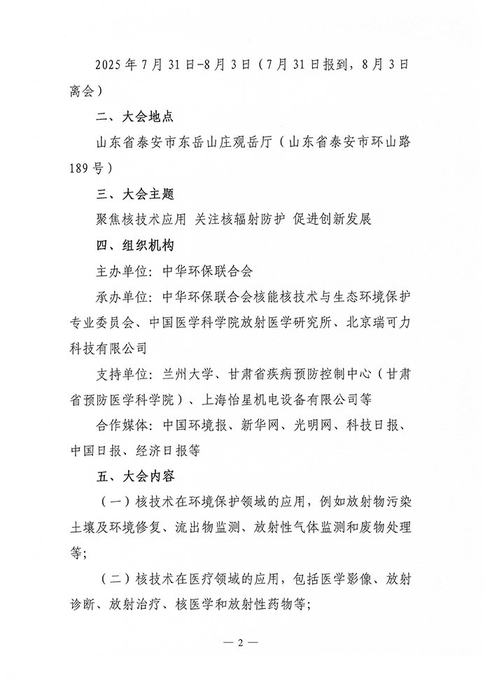 关于举办第二届核技术应用与辐射防护创新发展会议暨中华环保联合会核能核技术与生态环境保护专业委员会学术年会的通知 (第二轮)