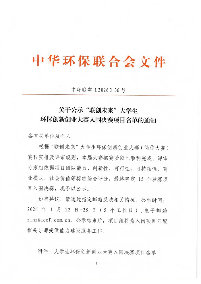 关于公示“联创未来”大学生环保创新创业大赛入围决赛项目名单的通知