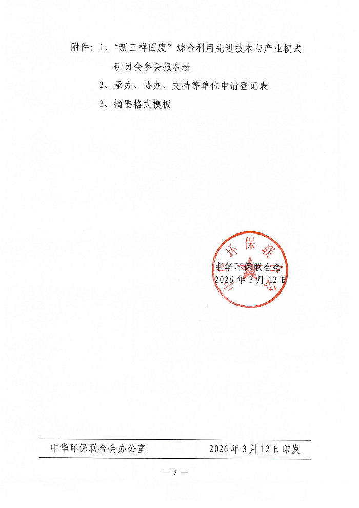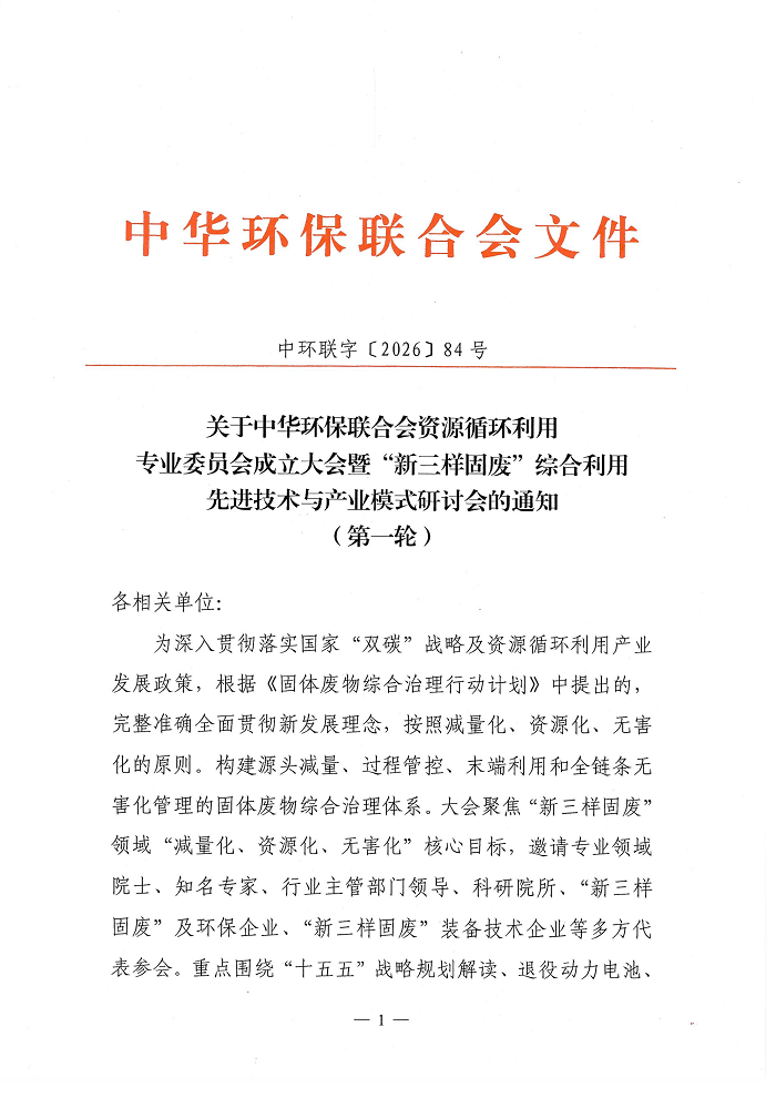 关于中华环保联合会资源循环利用专业委员会成立大会暨“新三样固废”综合利用先进技术与产业模式研讨会的通知(第一轮)