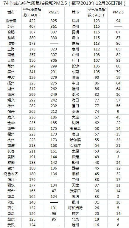 人民网北京12月26日电 (蒋琪)截至今天早上7时,连云港的AQI(空气质量指数)达到422,属于六级严重污染,成为74个公布PM2.5数据城市中空气质量最差的城市。今日空气质量最差的10个城市分别是连云港、苏州、合肥、盐城、淮安、上海、南通、无锡、常州、泰州,其中连云港、苏州、盐城、淮安、南通、无锡、常州、泰州等8个属于江苏省。据统计,今日江苏省12城市重度及以上污染。上海AQI指数超过300,属于六级严重污染。