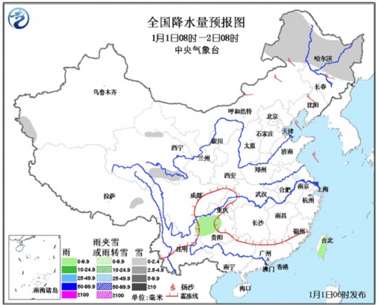 1月1日08时至2日08时,内蒙古东北部、黑龙江、青海东南部等地有小到中雪或阵雪。内蒙古东部、东北地区等地有4~5级风。南海西南部有6~8级的风。