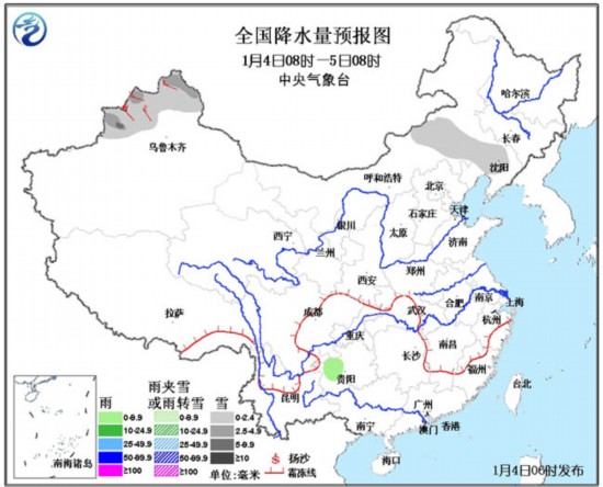 4日08时至5日08时,新疆北部、内蒙古中部和东南部、辽宁西部等地有小到中雪或阵雪,其中,新疆伊犁河谷的局部地区大雪;贵州西部有小雨或阵雨;新疆北部等地有4~6级风,其中山口地区风力可达8~9级。