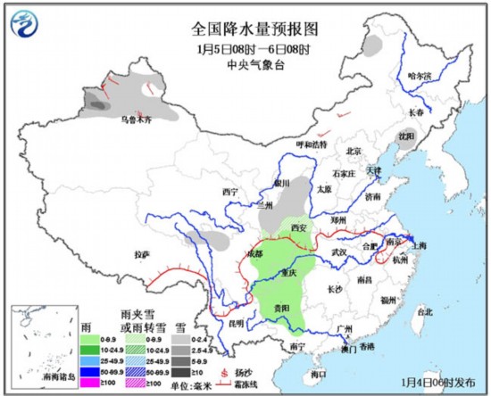 5日08时至6日08时,新疆北部、内蒙古东北部、辽宁中部、川西高原西北部、甘肃南部、陕西中北部等地有小到中雪或雨夹雪,其中新疆伊犁河谷的部分地区有大雪;陕西南部、四川盆地、贵州、广西西北部等地有小雨或阵雨。新疆北部有4~6级风,其中新疆山口地区风力可达7~8级。