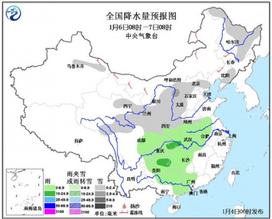 6日08时至7日08时,新疆沿天山地区、内蒙古南部、黑龙江北部和东部、吉林中部偏北地区、辽宁东部、西北地区中东部、华北北部和西部等地有小到中雪或雨夹雪;西南地区东部、江汉、黄淮西部、江淮西部、江南西部、华南中西部等地有小雨,局地中雨。新疆东部、内蒙古西部的部分地区有4~6级风。