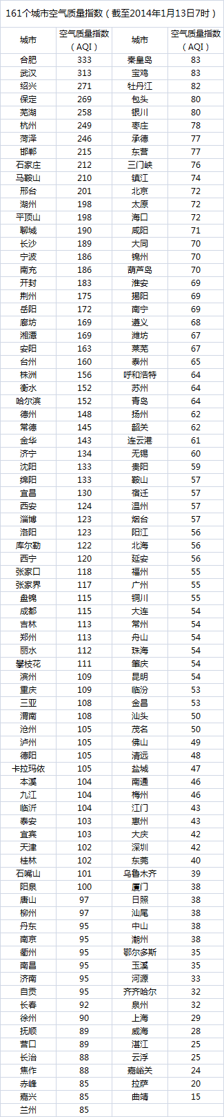 人民网北京1月13日电 (杨翼)目前环保部发布空气质量实时信息、空气质量月报及参与空气质量排名的地级城市已由74个增加到161个,包含了直辖市、省会城市、计划单列市、“三区”所有地级城市、环保重点城市和环保模范城市。人民网环保频道自今日起,将采用环保部的官方数据,对161个城市每日空气质量进行排行。