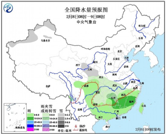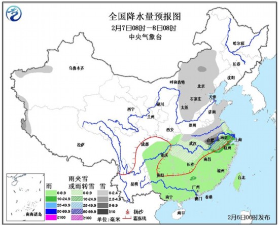 6日08时至7日08时,新疆西南部、西藏西部、内蒙古中西部偏南地区、西北地区东部、华北大部、黄淮、江汉、江淮、江南西北部等地有小到中雪或雨夹雪,其中,河南中南部、安徽北部、江苏中部偏西地区、湖北北部等地有大雪,部分地区有暴雪(10~16毫米)。西南地区中东部、江南、华南北部等地有小到中雨。