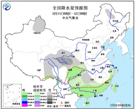 中国气象网讯 9~11日,南方地区多雨雪天气,气温偏低。江汉、江南大部、贵州等地将有雨夹雪或雪,其中,湖南中部、江西中部、浙江中部偏南地区的部分地区有大雪,局地暴雪(10~12毫米),上述地区积雪深度有5~8厘米,部分地区将出现道路结冰;另外,贵州中部、湖南西北部、江西南部等地的部分地区有冻雨;四川盆地、华南等地有小到中雨,局部地区大雨。