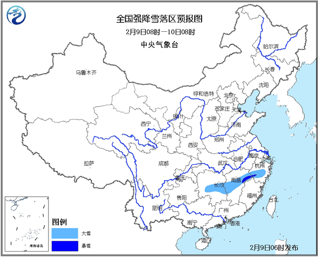 中央气象台今晨6时继续发布暴雪蓝色预警:预计今天白天到夜间,湖南中部、江西中部、浙江中部偏南地区的部分地区有大雪,其中,江西东北部、浙江西部的局部地区有暴雪(10~12毫米);上述地区积雪深度有5~8厘米,部分地区将出现道路结冰。另外,贵州中部、湖南西北部、江西南部等地的部分地区有冻雨。