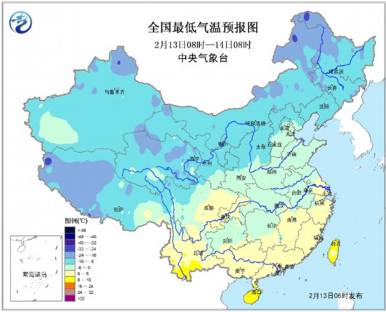 13日08时至14日08时,新疆西北部、西藏西南部、内蒙古东部、华北北部、贵州北部、安徽中南部、江西东部、浙江西部等地的部分地区有小到中雪或雨夹雪;四川盆地东南部、贵州南部、云南东部、广东、福建等地有小雨,贵州南部局地有冻雨。东海东北部和南部、台湾海峡有7~8级、阵风9级的东北风。