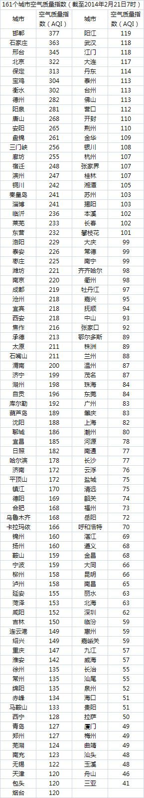 说明:自2014年1月1日起,环保部发布空气质量实时信息、空气质量月报及参与空气质量排名的地级城市已由74个增加到161个,包含了直辖市、省会城市、计划单列市、“三区”所有地级城市、环保重点城市和环保模范城市。人民网环保频道将采用环保部的官方数据,对161个城市每日空气质量进行排行。