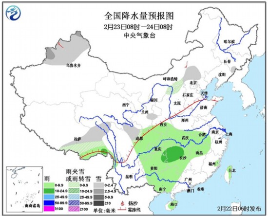 24日08时至25日08时,新疆北部、吉林东部和辽宁东部等地有小到中雪,其中新疆北部局地有大雪;西北地区东部、西南地区东部、江汉、江淮大部、江南大部、华南中西部等地有小到中雨或雨夹雪,其中湖北南部、安徽西南部、湖南北部、江西东北部等地的部分地区有大雨。