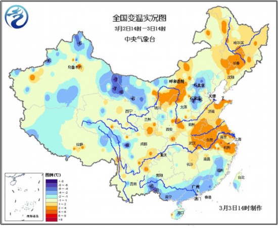 受冷空气影响,目前,我国新疆北部、甘肃西北部、内蒙古西部已出现降温天气。其中,甘肃西部局地今日14时较昨日同时次气温下降8℃。