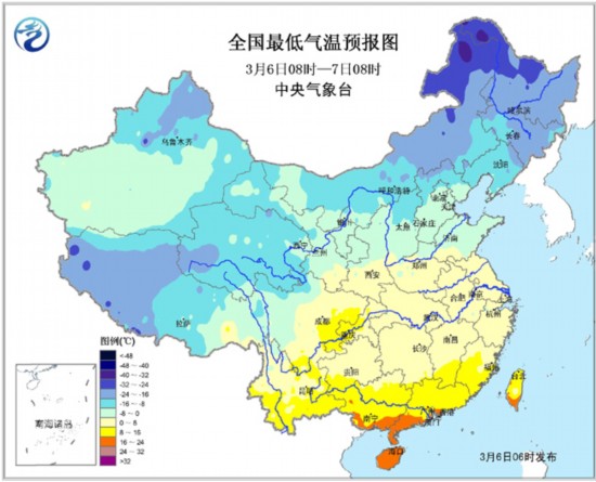 6日08时至7日08时,西藏东部、青海东部、川西高原北部、甘肃南部、宁夏南部等地有小雪或雨夹雪;陕西南部、黄淮西部、江汉、江淮、江南、华南、西南地区东部、台湾等地有小到中雨。内蒙古东部、东北等地有4~5级风。东海南部、台湾海峡有7~9级的风,东海北部、南海东北部有6~8级的风。