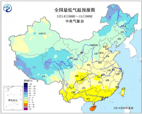 14日08时至15日08时,新疆西北部、内蒙古东北部有小雪或雨夹雪;云南东部、贵州、广西、广东西部、海南等地有小雨。内蒙古中西部有4-5级偏西风。东海北部将有6~8级、阵风9级的西北风。
