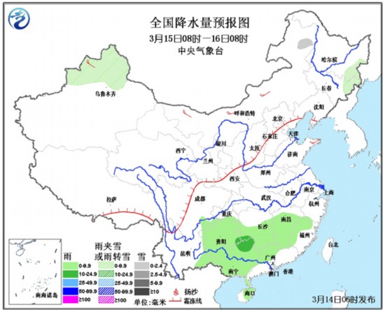 15日08时至16日08时,新疆北部、黑龙江东南部、吉林东部等地有小雪或雨夹雪;江南中南部、广西、广东西部、贵州、云南东部、海南等地有小到中雨。新疆西北部、内蒙古中西部等地有4-5级风。