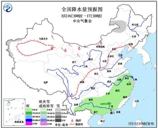 16日08时至17日08时,内蒙古东北部等地有小雪;江淮南部、江南西南部和中东部、云南东南部、贵州南部、广西、广东大部等地有小到中雨。此外,甘肃西部、内蒙古中西部等地有浮尘或扬沙。新疆东部、甘肃西部、内蒙古中西部等地有4~6级风。