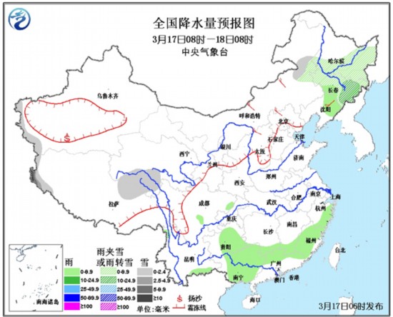 17日08时至18日08时,内蒙古东北部、黑龙江大部、吉林、新疆西南部、西藏西部和东北部、青海西南部等地的部分地区有小雪或雨夹雪,其中,西藏西部的部分地区有中到大雪,局地暴雪;江南南部和东部、贵州东部、广西、广东北部等地有小雨或阵雨。此外,内蒙古中东部、华北北部、东北地区等地有4~5级风。