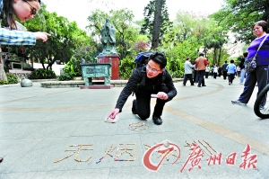 叶榄用捡来的烟头在东湖公园摆出“无烟深圳”字样。