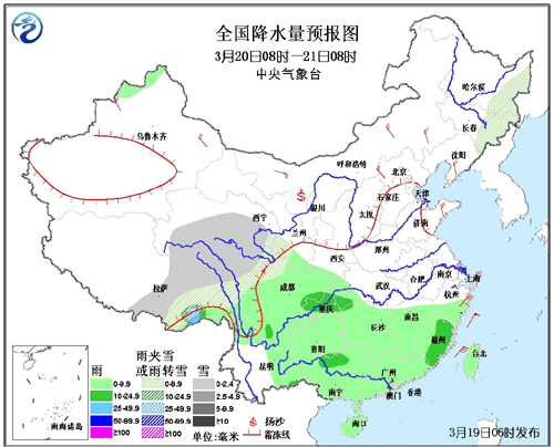 3月19日08时至20日08时,西藏西南部和东北部、青海南部、内蒙古东北部、东北中东部、华北北部等地有小到中雪或雨夹雪;华北中部以及南方大部地区有小到中雨,其中,四川盆地南部、贵州北部、江西中部、浙江西部等地的局部地区有大雨。新疆北部、甘肃西部、内蒙古中西部、华北大部、黄淮东部、江淮东部有4~6级风。甘肃西部、内蒙古西部、南疆盆地等地的局部地区有扬沙或沙尘暴等沙尘天气。