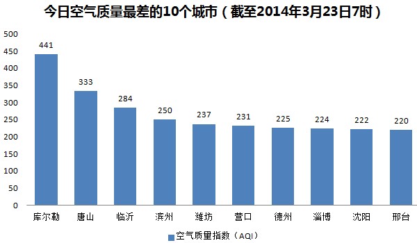 人民网北京3月23日电(杨翼) 根据环保部公布的最新数据,库尔勒连续3天空气严重污染。截至今天早上7时,库尔勒的AQI(空气质量指数)达到441,属于严重污染,成为161个参与空气质量排名的城市中空气质量最差的城市。今日空气质量最差的10个城市分别是库尔勒、唐山、临沂、滨州、潍坊、营口、德州、淄博、沈阳和邢台。其中临沂、滨州、潍坊、德州、淄博等五个城市属于山东省。