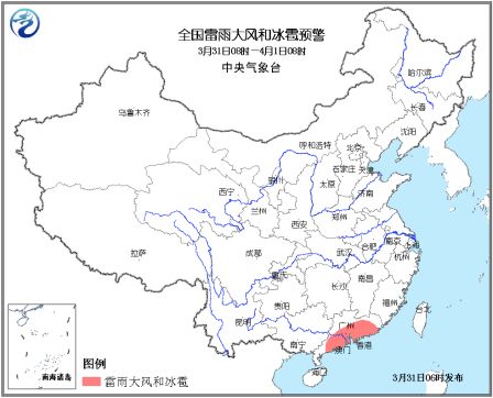 中央气象台同时于3月31日06时继续发布强对流天气蓝色预警: