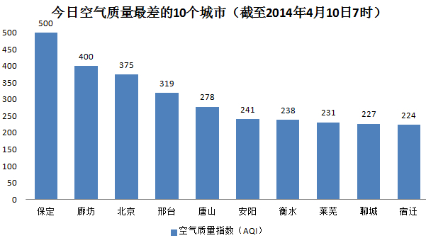 人民网北京4月10日电 (杨翼)根据环保部公布的最新数据,截至今天早上7时,保定的AQI(空气质量指数)“爆表”达到500,属于严重污染,成为161个参与空气质量排名的城市中空气质量最差的城市。今日空气质量最差的10个城市分别是保定、廊坊、北京、邢台、唐山、安阳、衡水、莱芜、聊城和宿迁。北京空气由前两日的重度污染升级为严重污染。