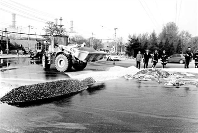 正在现场指挥铲车作业的一位先生告诉北京青年报记者,这些盐酸洒落在路面长度有15米左右,宽度大约2-3米。除了用水稀释外,他们还将石灰和沙子石铺撒在路面上,主要目的就是吸附那些被稀释后的盐酸溶液,减少其渗入地下而对周边环境造成进一步影响。