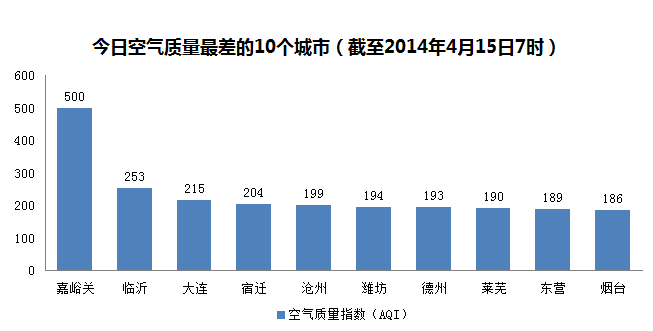 人民网北京4月15日电 根据环保部公布的最新数据,截至今天早上7时,嘉峪关的AQI(空气质量指数)“爆表”,达到500,属于六级严重污染,成为161个参与空气质量排名的城市中空气质量最差的城市。今日空气质量最差的10个城市分别是嘉峪关、临沂、大连、宿迁、沧州、潍坊、德州、莱芜、东营和烟台。除嘉峪关外,仅三城重度污染。