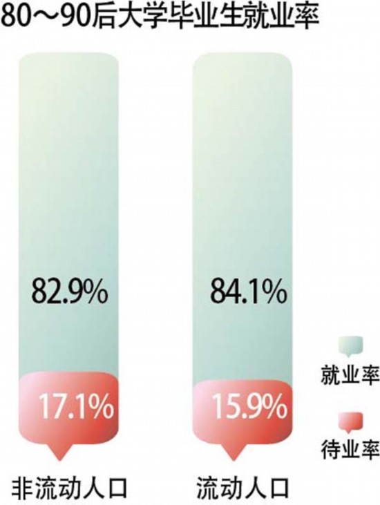 调查结果显示,80~90后的大学毕业生中,处于流动状态的,其就业率比非流动的大学毕业生略高。