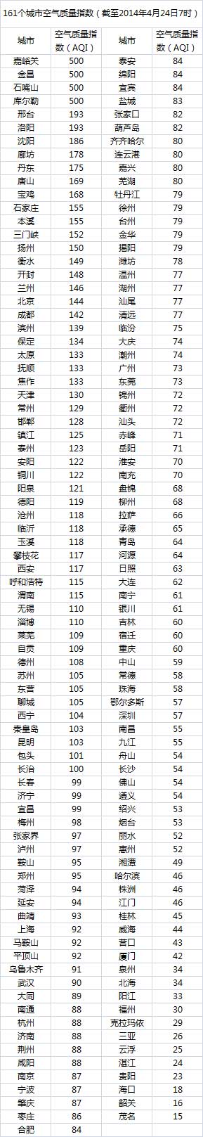 说明:自2014年1月1日起,环保部发布空气质量实时信息、空气质量月报及参与空气质量排名的地级城市已由74个增加到161个,包含了直辖市、省会城市、计划单列市、“三区”所有地级城市、环保重点城市和环保模范城市。人民网环保频道将采用环保部的官方数据,对161个城市每日空气质量进行排行。