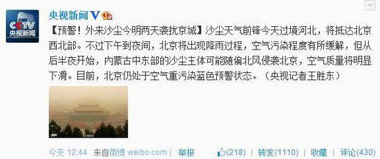 据中央电视台新闻中心官方微博消息,沙尘天气前锋今天过境河北,将抵达北京西北部。不过下午到夜间,北京将出现降雨过程,空气污染程度有所缓解,但从后半夜开始,内蒙古中东部的沙尘主体可能随偏北风侵袭北京,空气质量将明显下滑。