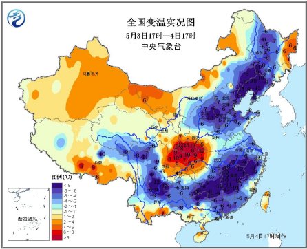 人民网北京5月5日电 (杨翼)受东北冷涡以及冷空气迅速南下影响,今天白天,我国中东部大部分地区的气温出现明显下降,多地降温幅度超过8℃。预计明日,南方地区的降雨强度将较今日有所减弱。